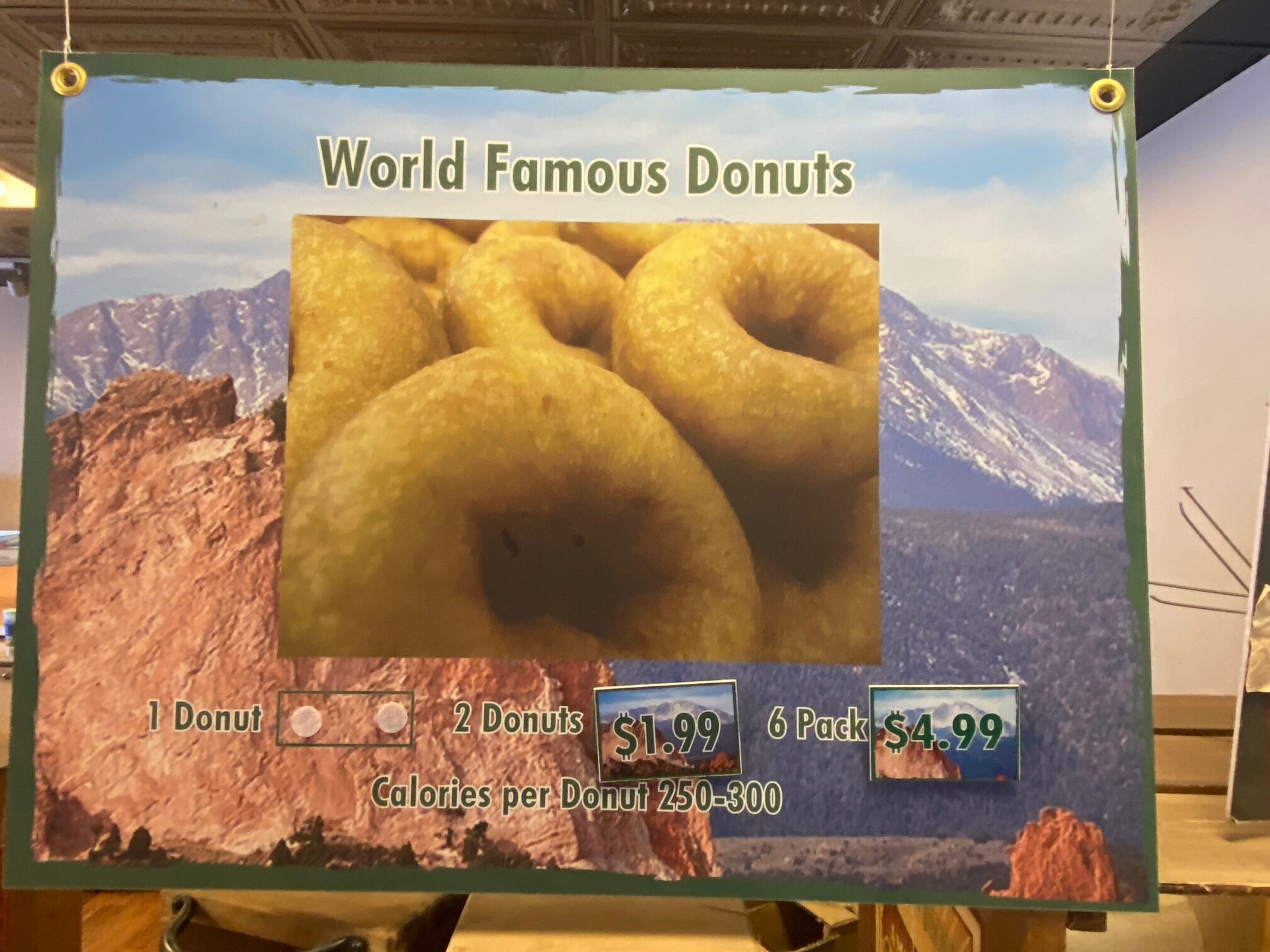 そしてパイクスピーク名物のドーナッツ!おなかすいてたので写真撮る前に食べちゃいました。看板の写真でゴメンなさい。世界一高い場所で揚げているドーナツ。 油の沸点の事情でここでドーナツを揚げるのはとても難しいそうです。